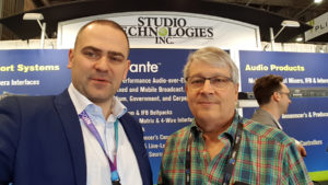 Sebastian Pawlak (left), owner of Pawlaki Pro Audio in Poland and Gordon Kapes, president of Studio Technologies, Inc., meet at NAB 2019
