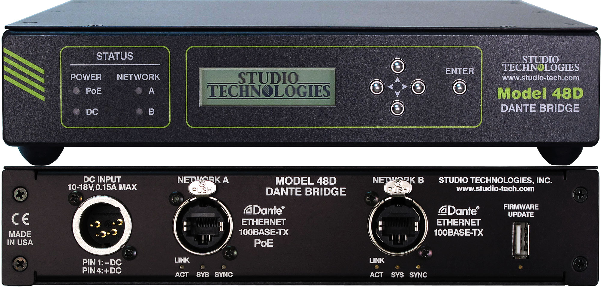 SKOKIE, IL, 25 OCTOBER 2018 – Studio Technologies, manufacturer of high-quality audio, video, and fiber-optic solutions, introduces the Model 48D Dante Bridge, which offers a simple to use, high performance means of sending and receiving audio signals between two independent local area networks (LANs). Users can interconnect up to four Dante® audio channels in each direction with full isolation and preservation of network security. The Model 48D is compliant with Dante Domain Manager (DDM) and supports AES67 digital audio signals. Internal circuitry provides sample rate, timing, and bit-depth correction to maintain audio signal integrity. The Model 48D can help alleviate Dante LAN interconnectivity challenges, allowing users to enjoy the ease-of-use, excellent audio performance, and strong interoperability of Dante audio-over-Ethernet (AoE) technology.