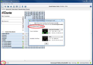 Open version 4.10.0.2 of Dante Controller for Windows and navigate to the lower left-hand corner. One should find a green box with “P:” next to it; this is a link to the Dante Interfaces window. This window allows the user to select the desired Dante Interfaces from which Dante Controller will list devices. Clicking on the green box should open the window. Towards the top of the window is a checkbox labeled “Use shared Dante interface.” Make sure this checkbox is checked. This allows the programs with Dante discovery and conmon to share a network interface selection. Unfortunately, Dante licensees, such as Studio Technologies, are restricted from allowing their end user software to select network interfaces other than that used by Audinate’s end user software, even if they are not concurrently installed. Finally, restart STcontroller which should then repopulate the device list.
