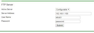 Open a web browser and go to the Current Management IP Address listed on the front-panel display of the Model 5401. Login to the Model 5401’s web GUI and Navigate to the “System Information” page. On the bottom of this page there is a section called “FTP Server”. Set the “Active Server” dropdown to “Configurable” and click “Submit”. This should enable the grayed-out text fields. For the “Server Address” field enter the server’s IP address of 192.168.1.100. Set “User Name” to “M5401” and the “Password” to “password”. Press “Submit” and the FTP server configuration should be saved.