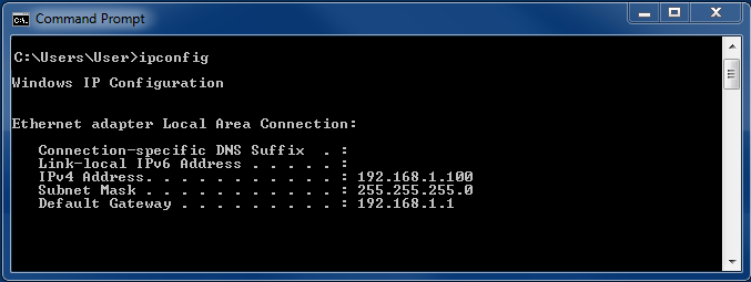 Now that the FTP server is configured and the update files are in the correct directory the final step before updating the device is configuring the FTP settings on the Model 5401. The server’s IP address (the PC’s IP address) is needed for the configuration. To get this open the command prompt and type “ipconfig” and hit “Enter”. Locate the IPv4 Address listed in the Local Area Connection section (in this example the address is 192.168.1.100).