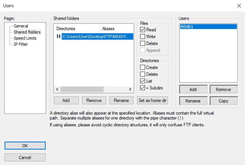 Next, navigate to the “Shared folders” page listed on the left-hand side of the window. Here a directory will need to be added for the device to access and download the necessary files for the software update. Click “Add” in the “Shared folders” section to add the new directory (in this example, “C:\Users\User\Desktop\FTP\M5401\” is the chosen directory but the directory can exist anywhere in the computer file system). Once the directory is selected ensure the “Read”, “List”, and “+ Subdirs” checkboxes are checked. This will only allow a device logging into the FTP server to read (download) files from the selected directory and any other directories that may be listed in the selected directory. Click “Ok” in the lower left-hand corner to save the changes.