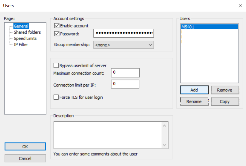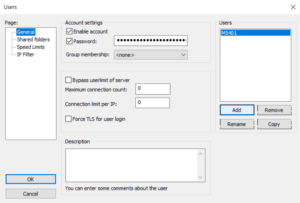 Now that the program is installed a user account will need to be created for the device that needs updating. In this example, a Model 5401 Dante Master Clock will be updated. Open Filezilla Server and navigate to “Edit” > “Users” in the upper toolbar. The “Users” window should pop up. On the right-hand side click “Add” to add a new user. In this case enter “M5401” and leave the group selection to “none” (it’s important to note that the username can be anything but it is good practice to set the username to the model name). Press “Ok” to exit the “Add user account” window. Ensure the “Enable account” checkbox under the “Account settings” section is checked. Check the “Password” checkbox in the “Account settings” section and enter a password for the account (“password” is used in this example).