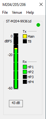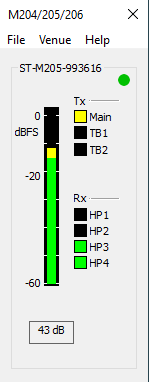 The Windows version of STcontroller also includes VenueView, a means of monitoring multiple Studio Technologies’ devices. This is provided for technical personnel who need to maintain correct system operation of units in one or more physical locations. Real-time monitoring of audio level and signal presence is provided for the following Studio Technologies products: